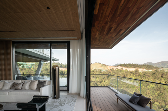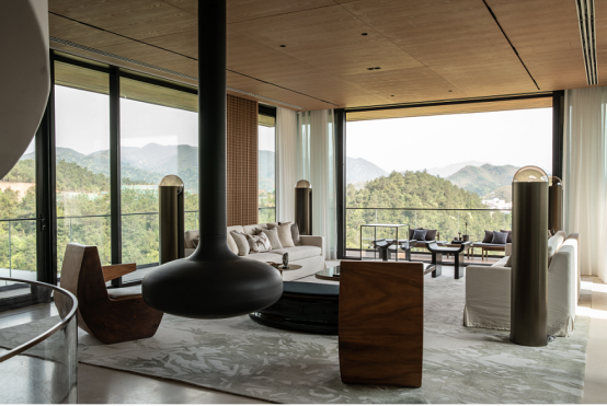 此次项目中,无间设计利用环绕的露台将室内和山峦竹林拉近,成为温暖气质和宏大精神的连接点。层层错落的露台之间遥遥相望,身处任何独立空间,身与心都能找到与家人的情感链接。
