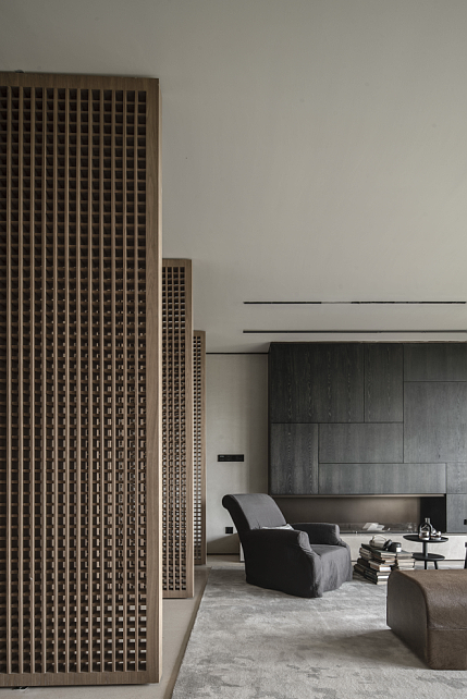 东方建筑中格珊门透着光影,可开可合,随着中轴线的转动,灵动地跃于空间。光影跃动在草编元素的艺术作品、在粗拙的石灰石材质茶几、在似云似墨的地毯,配合回响在山间的音乐、跳动的炉火,山居氛围被推至顶点。