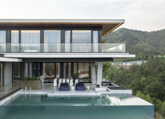 围坐在户外混凝土下沉式围炉区,嵌入自然中去,倾听耳畔的流水,感受跃动的火光。建筑和室内的关系、局部和整体之间、人与自然交融无间。透明悬空的泳池,似一个晶莹的蓝水晶漂浮在山间,黑夜池底部闪耀点状灯光,有如水中繁星,遥应星际宇宙的广博。