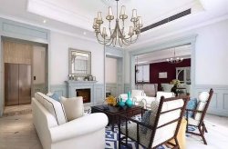 今天分享混搭风的现代美式与清幽中式混搭设计案例~ 法式唯美清新在这里被凝聚,白色布艺沙发和螺纹铁艺单人椅呈现着田间的畅然;蓝白菱形地毯率真凛然,为客厅带来海风般地凉