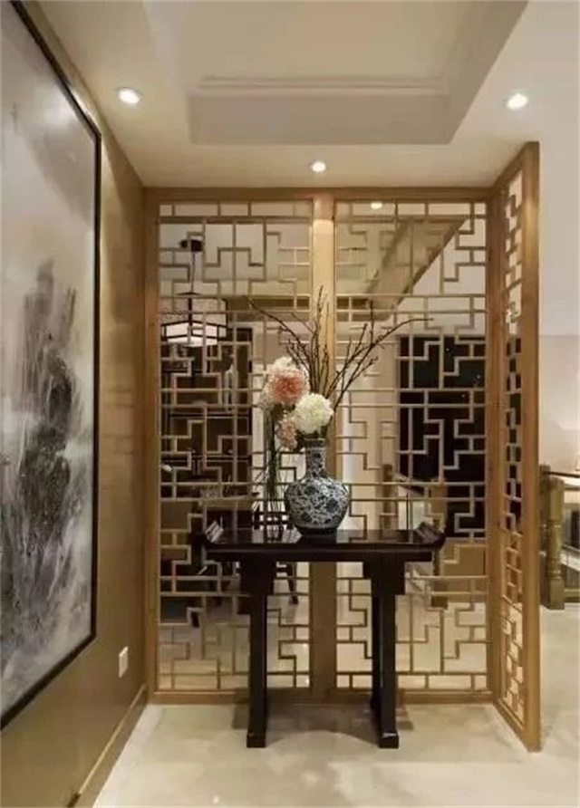 进门的屏风,旁边是珍藏山水墨画,端景台上不时更换鲜花搭配瓷器瓶,更加显得大气优雅。