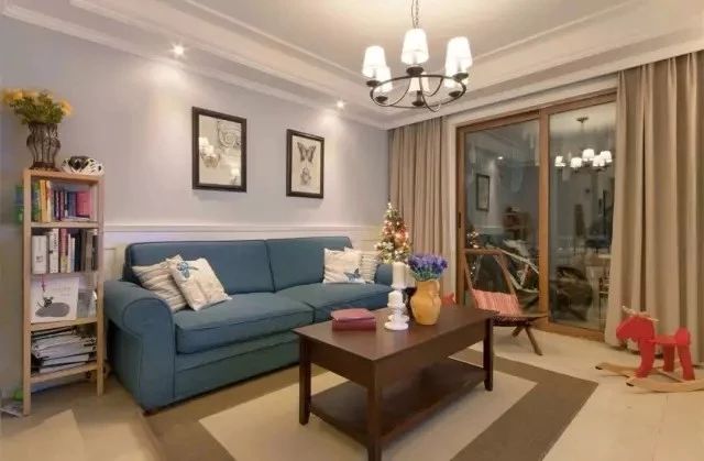 蓝灰色的沙发背景墙面,下半身做成半护墙,搭配深蓝色沙发,以及深木色茶几,还有咖啡色的窗帘,温馨的感觉满满。