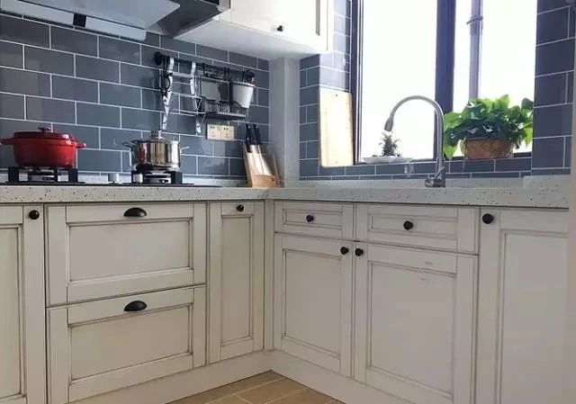中式厨房整体用了美式标配的地铁砖,厨房小转角的飞碟非常实用,把橱柜死角利用起来,不规则的厨具终于有了去处。