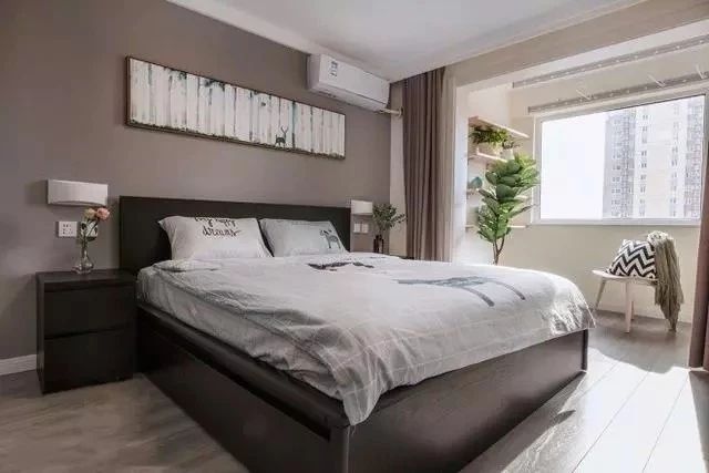 主卧带个封闭式阳台,两者之间由窗帘隔开,没有墙体。采光和面积都大了不少。