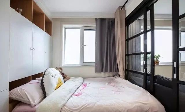 卧室中放个书桌就能同时兼顾书房的功能,与客厅之间只隔了一个黑框推拉玻璃门,既增加了房间采光,又没有实体墙的压抑感。