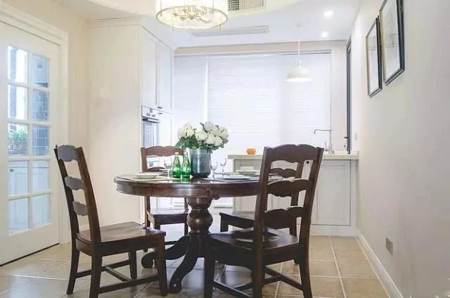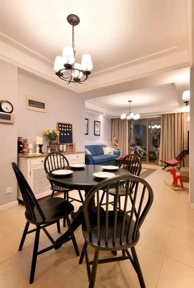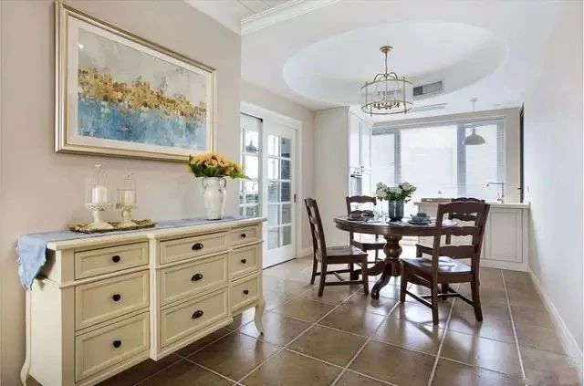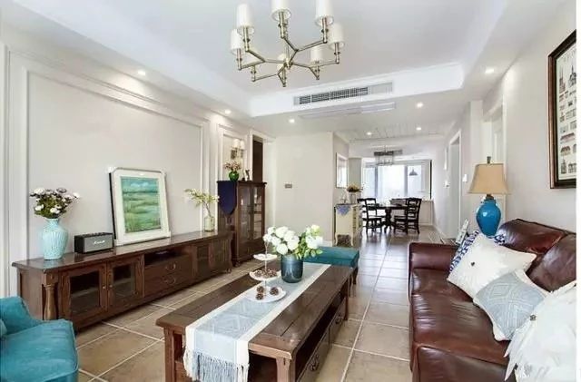 客厅整体方方正正的,大大的落地窗,稳重的油蜡皮沙发,经典美式的台灯与落地灯,是很多人心中的美式。电视柜边上的展示柜,颜值高且实用,可以收纳可以收藏。