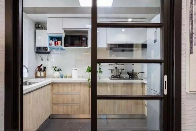 为了满足业主收纳需求,厨房设计了可以增加储物空间的U型橱柜,把微波炉嵌入橱柜,方便实用,又节省空间。