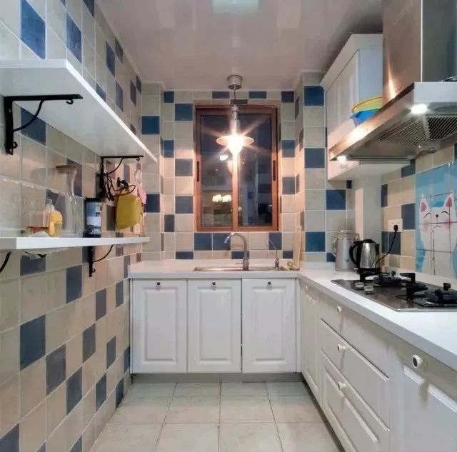 蓝色与浅色瓷砖让整个厨房富有生机,墙面的一字隔板收纳功能强大。