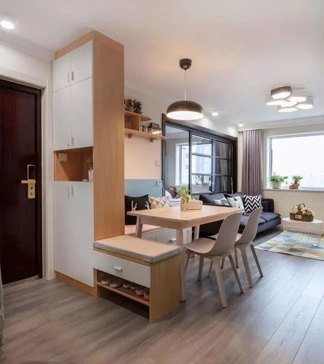 门厅墙体拆除后通透性更强,再加上带换鞋凳的定制鞋柜,鞋柜做了定制卡座,换鞋凳可以两用,还可以用做餐凳。