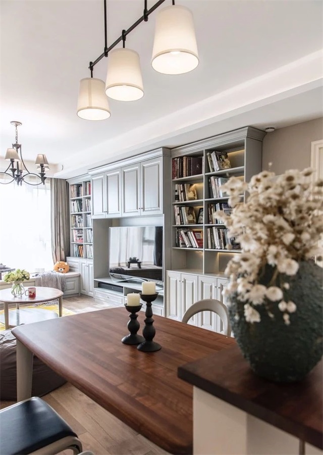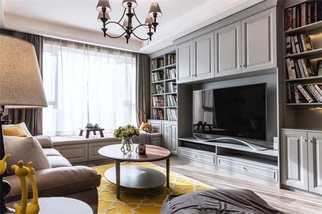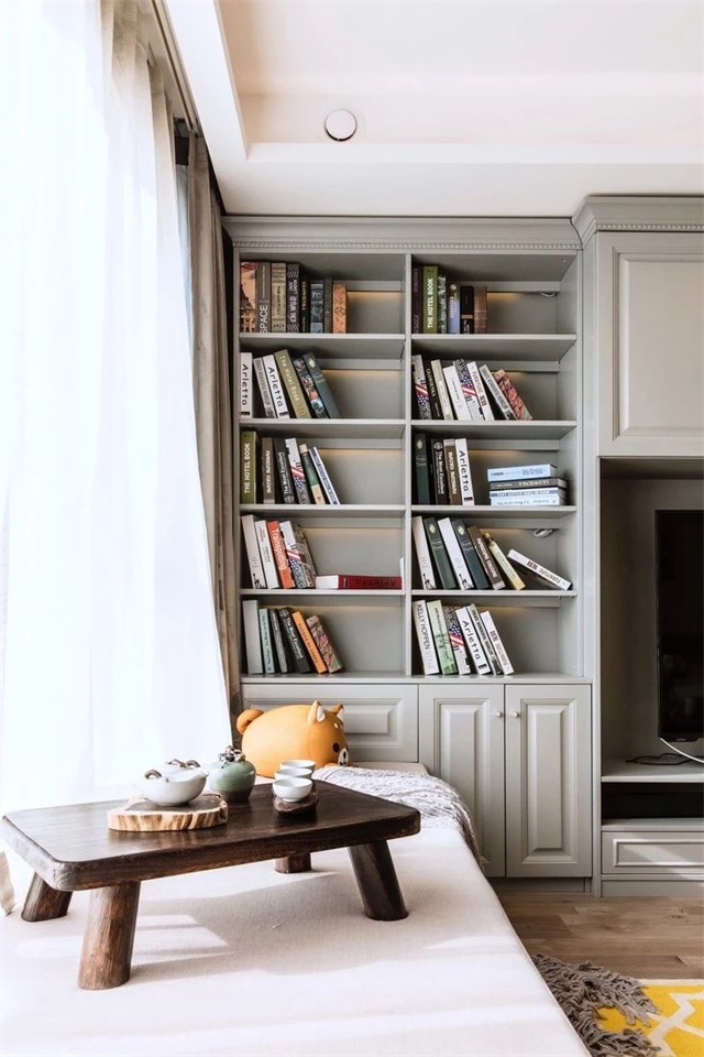 电视墙改造成十分实用的造型,展示和收纳功能各占一半。