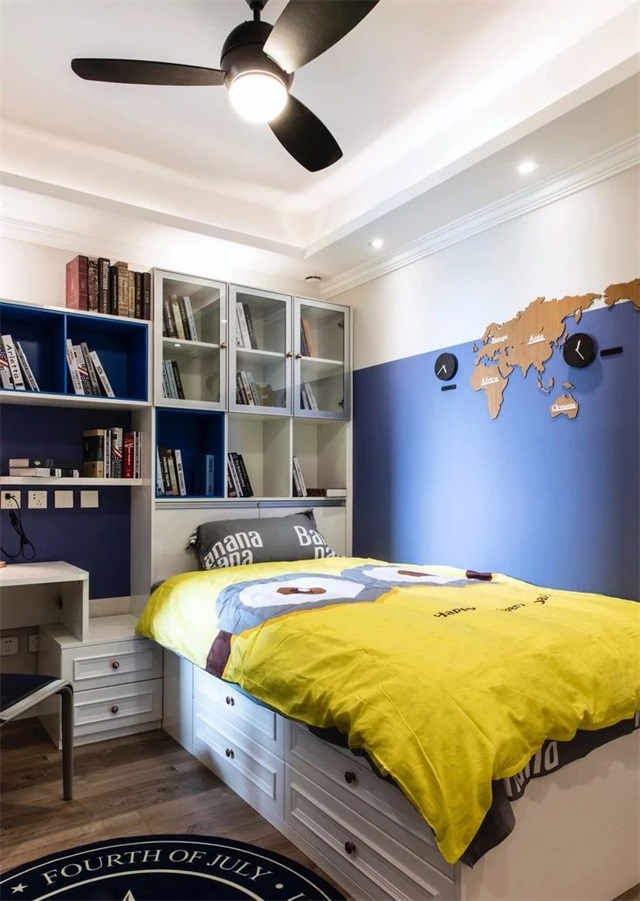 儿童房采用了和客厅墙同样的处理手法,床柜一体的家具提供了大量的收纳空间,还腾出了学习区的布置空间。