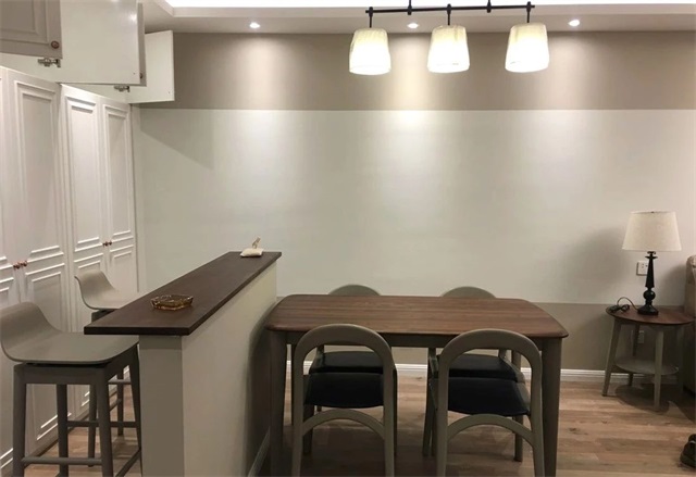 单一的餐厅功能被吧台一分为二,满足餐桌靠墙的布置,同时也多出一个日常办公喝下午茶的功能,满足了屋主在家工作的需要。