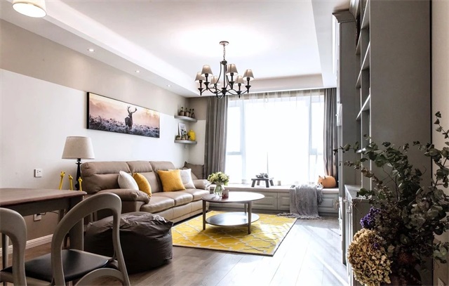 硬装完工之后的样子,空间格局有了很大的。8米长大客厅,靠近落地窗设计了休闲小飘窗,还是带储物功能的。