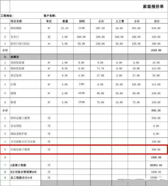 像这种无中生有的收费比比皆是,就拿“垃圾清理费”和“垃圾清运费”来说,这两者其实就是一项工作量,写成两项就可以多收费,所以大家以后碰到了一定要求装修公司给扣掉。